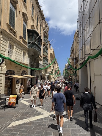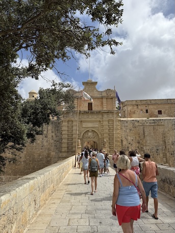城壁に囲まれた旧市街、イムディーナへの橋。人が続々と入っていく。