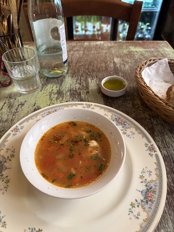 白身魚のスープ。トマトベースのあっさりしたスープで、これが白ワインとよく合う。幸せだ。