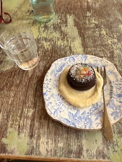 続いてツナのトマトソースパスタ。当然うまい。デザートはチョコのケーキとプリンのようなソース。まったくもって美味い。